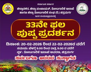 ಚಿತ್ರದುರ್ಗದ ತೋಟಗಾರಿಕೆ ಇಲಾಖೆ ಆವರಣದಲ್ಲಿ ಇದೇ 20ರಿಂದ 22 ರವರೆಗೆ ಜಿಲ್ಲಾಡಳಿತ ಜಿಲ್ಲಾಪಂಚಾಯತ್ ಜಿಲ್ಲಾ ತೋಟಗಾರಿಕೆ ಇಲಾಖೆ ಮತ್ತು ತೋಟಗಾರಿಕೆ ಸಂಘದಿಂದ 33ನೇ ಫಲಪುಷ್ಪ ಪ್ರದರ್ಶನ ಆಯೋಜಿಸಲಾಗಿದೆ ಎಂದು ಜಿಲ್ಲಾ ಪಂಚಾಯಿತಿ ಸಿಇಓ ಡಾ. ಆಕಾಶ್ ಹೇಳಿದರು.