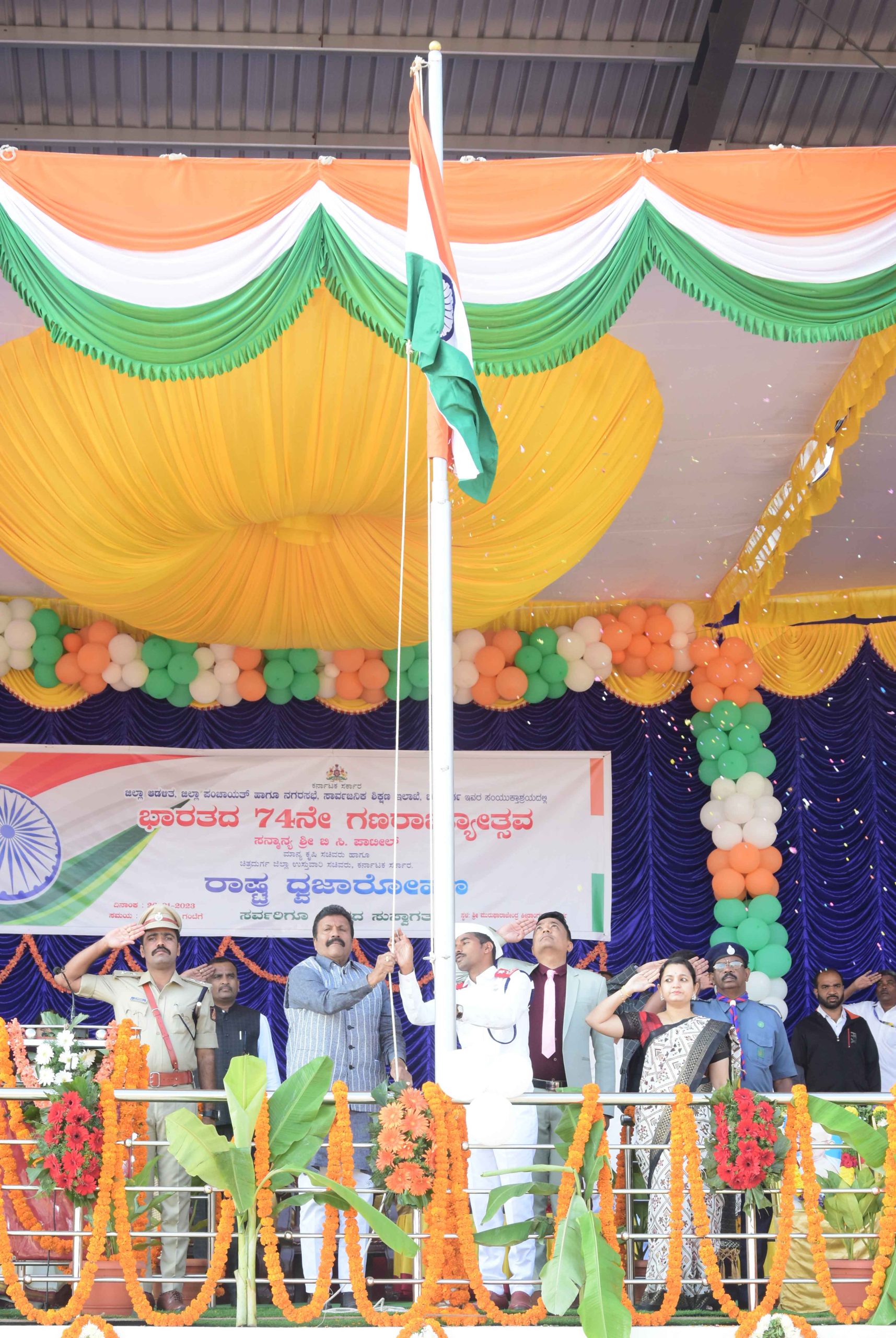 ನಗರದ ಸರ್ಕಾರಿ ವಿಜ್ಞಾನ ಕಾಲೇಜು ಮೈದಾನದ ಮುರುಘರಾಜೇಂದ್ರ ಕ್ರೀಡಾಂಗಣದಲ್ಲಿ ಗುರುವಾರ ಜಿಲ್ಲಾಡಳಿತ ವತಿಯಿಂದ ಆಯೋಜಿಸಲಾದ 74ನೇ ಗಣರಾಜ್ಯೋತ್ಸವ ದಿನಾಚರಣೆಯಲ್ಲಿ ರಾಷ್ಟ್ರ ಧ್ವಜಾರೋಹಣ ನೆರವೇರಿಸಿದರು. ಬಳಿಕ ಮೈದಾನದಲ್ಲಿ ತೆರೆದ ಜೀಪಿನಲ್ಲಿ ಕವಾಯತು ತಂಡಗಳ ಬಳಿ ಸಾಗಿ, ಗೌರವವಂದನೆ ಸ್ವೀಕರಿಸಿದರು. ನಂತರ ಗಣರಾಜ್ಯೋತ್ಸವದ ಸಂದೇಶ ನೀಡುವ ಸಂದರ್ಭದಲ್ಲಿ ಡಾ. ಬಿ.ಆರ್. ಅಂಬೇಡ್ಕರ್ ಅವರನ್ನು ಸ್ಮರಿಸಿದ ಸಚಿವರು, ಸಂವಿಧಾನ ರಚನೆ ಪೂರ್ಣಗೊಳಿಸಲು 2 ವರ್ಷ 11 ತಿಂಗಳು ಬೇಕಾಯಿತು. ಈ ಸಂವಿಧಾನ 1950 ಜನವರಿ 26 ರಂದು ಜಾರಿಗೆ ಬಂದಿತು. ಇದರ ನೆನಪಿಗಾಗಿ ಗಣರಾಜ್ಯೋತ್ಸವವನ್ನು ವಿಜೃಂಭಣೆಯಿಂದ ಅಚರಣೆ ಮಾಡಲಾಗುತ್ತಿದೆ. ನಮ್ಮದು ಅತ್ಯಂತ ದೊಡ್ಡ ಪ್ರಜಾಪ್ರಭುತ್ವ ದೇಶ, ಇಲ್ಲಿ ಪ್ರಜೆಗಳು ಆಳುವವರನ್ನು ಆಯ್ಕೆ ಮಾಡುತ್ತಾರೆ. ಈ ಮೂಲಕ ಪ್ರಜೆಗಳೇ ಸ್ವತಃ ಆಡಳಿತ ನಡೆಸುವ ಮಾದರಿ ದೇಶದಲ್ಲಿದೆ ಎಂದ ಸಚಿವರು, ವೀರ ಸಂಗೊಳ್ಳಿ ರಾಯಣ್ಣ ಒಬ್ಬ ದೇಶಭಕ್ತ, ಇಂತಹ ವೀರಯೋಧ ಬಲಿದಾನಗೊಂಡ ದಿನವೂ ಇದಾಗಿದೆ ಎಂದು ಸಂಗೊಳ್ಳಿ ರಾಯಣ್ಣರನ್ನು ಕೂಡ ಇದೇ ಸಂದರ್ಭದಲ್ಲಿ ಸ್ಮರಿಸಿದರು.