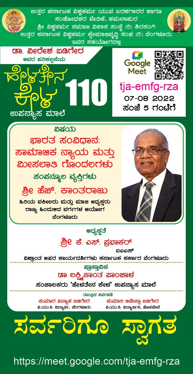 ಉತ್ತರ ಕರ್ನಾಟಕ ವಿಶ್ವಕರ್ಮ ಯುವ ಬರಹಗಾರ ಹಾಗೂ ಸಂಶೋಧಕರ ವೇದಿಕೆ,ವಿಶ್ವ ಕರ್ಮ ವಿಕಾಸ ಸಂಸ್ಥೆ, ಶಿರಸಂಗಿ ವಿಶ್ವಕರ್ಮ ಕ್ಷೇಮಾಭಿವೃದ್ಧಿ ಸಂಘ, ಬೆಂಗಳೂರು ಇವರ ಸಹಯೋಗದಲ್ಲಿ ಡಾ. ವೀರೇಶ ಬಡಿಗೇರ ಅವರ ಪರಿಕಲ್ಪನೆಯ ಹೇಳತೇನಾ ಕೇಳ 110 ಉಪನ್ಯಾಸ ಮಾಲೆ ಗೂಗಲ್ ಮೀಟ್ ನಲ್ಲಿ 07.08.22 ರಂದು ಸಂಜೆ ನಡೆಯಲಿದೆ.