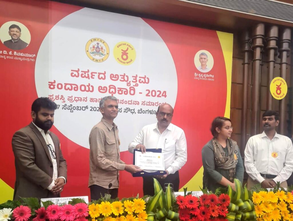 ಬೆಂಗಳೂರಿನ ವಿಕಾಸಸೌಧದಲ್ಲಿ ಶುಕ್ರವಾರ ನಡೆದ ಕಂದಾಯ ಇಲಾಖೆಯ ಪ್ರಗತಿ ಪರಿಶೀಲನಾ ಸಭೆ ಹಾಗೂ ಅಭಿನಂದನಾ ಸಭೆಯಲ್ಲಿ ಕಂದಾಯ ಇಲಾಖೆ ಸಚಿವ ಕೃಷ್ಣಭೈರೇಗೌಡ ಹಾಗೂ ಪ್ರಧಾನ ಕಾರ್ಯದರ್ಶಿ ರಶ್ಮಿ ವಿ ಮಹೇಶ್ ಅವರು ಜಿಲ್ಲಾಧಿಕಾರಿ ಟಿ.ವೆಂಕಟೇಶ್ ಅವರಿಗೆ “ವರ್ಷದ ಅತ್ಯುತ್ತಮ ಕಂದಾಯ ಅಧಿಕಾರಿ-2024ರ ಪ್ರಶಸ್ತಿ ನೀಡಿ ಗೌರವಿಸಿದರು.